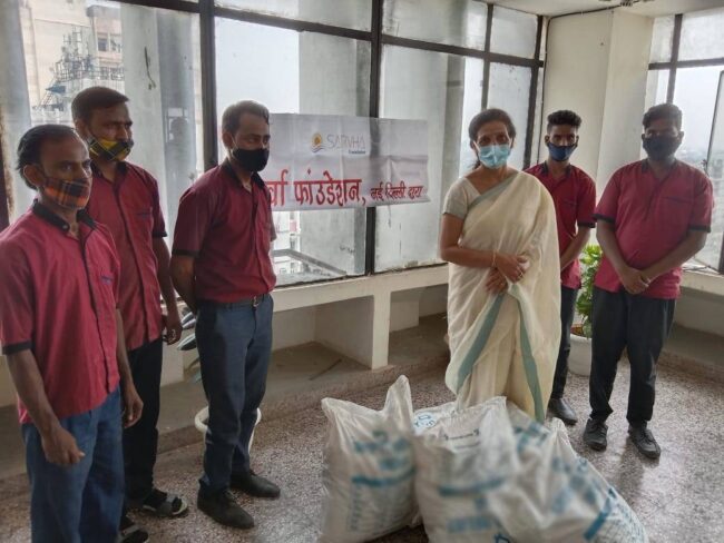 Acharya Anita, founder trustee of Sarvha Foundation distributed Ration Relief Kit to the maintenance staff of Prakash Deep Building.