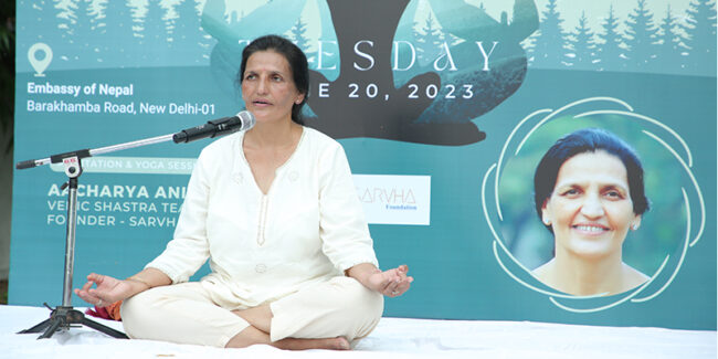 Acharya Anita, led a yoga session held at the Nepalese Embassy in New Delhi prior to the occasion of International Yoga Day. Various ambassadors, diplomats, and special guests from the embassies of Italy, Japan, Turkey, Belarus, the Philippines, Myanmar, and Argentina participated in the yoga session.