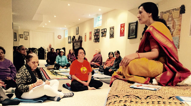 Aacharya Anita addresses a spiritual gathering at Bharat Mata Mandir, Brampton, Canada.