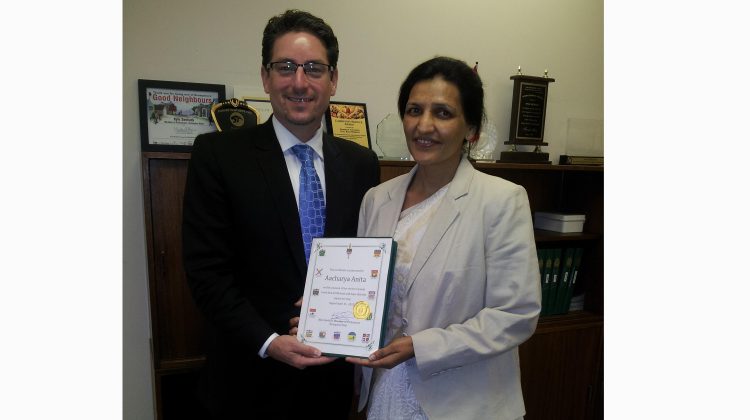 During her visit to Canada, Aacharya Anita was felicitated by Canadian Member of Parliament for Brampton West Mr. Kyle Seeback.